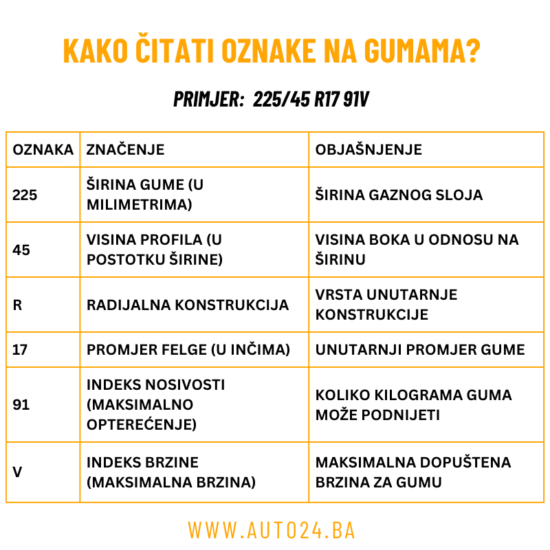 - Čitajte oznaku npr. 205/55 R16 91V: širina 205 mm / profil 55% / felga 16″ / indeks nosivosti 91 / brzinski indeks V.